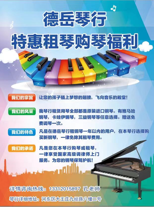 天津市德岳琴行坐落于天津市河东区九经路8增2号底商,成立于二零一九年三月。是由国家高级钢琴调律师、库珀钢琴生产技师创办的一家琴行(德国库珀Cooper&Sons钢琴厂家直营店)。主要经营:乐器和服装的批发销售及租赁、钢琴维修保养、钢琴技术培训、批发和零售业、及文化艺术演出服务等业务为一体的综合性琴行。琴行主营德国库珀钢琴,以高质量高品质为宗旨,为广大用户提供一站式的便捷服务!